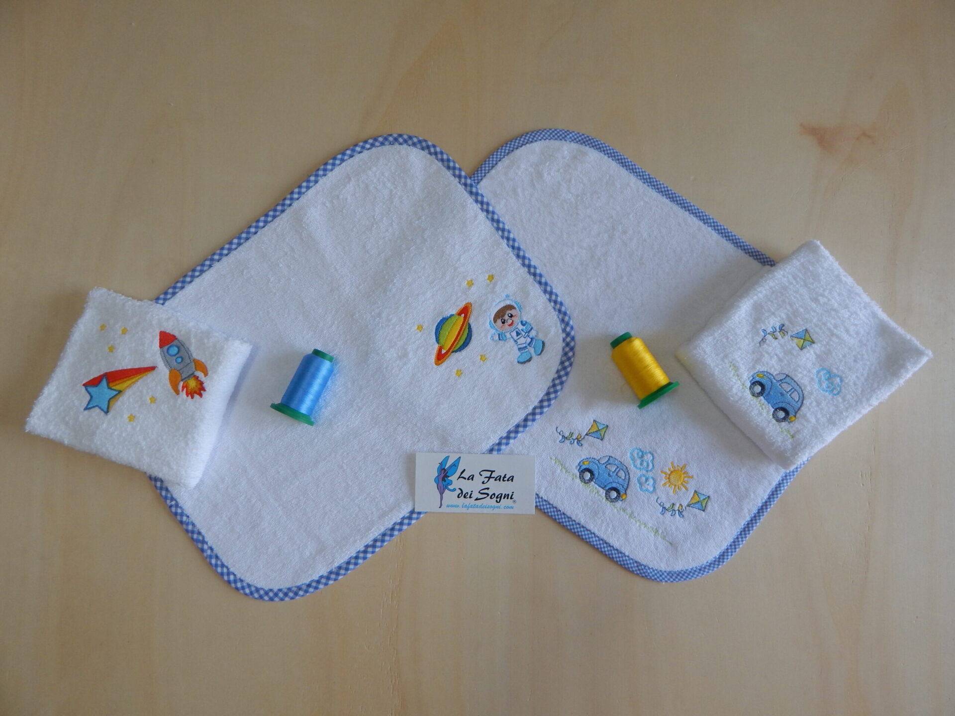 Set Asilo Duo Tovaglietta e Asciughino in Spugna ,Ricamo Punto Pieno, Rifinita in Sbieco Cotone 100%