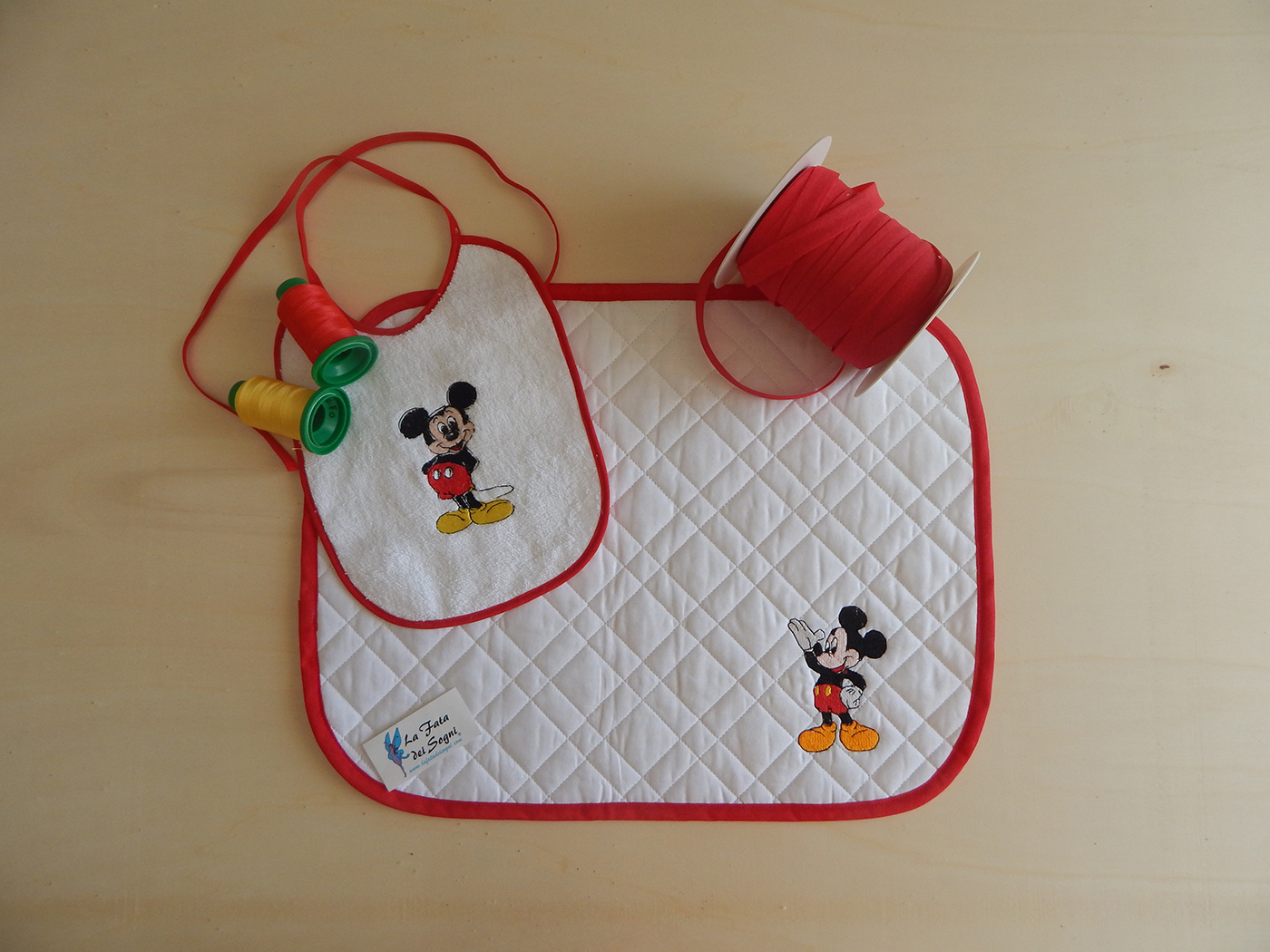 Set Asilo Personaggi Tovaglietta e Bavetta Trapuntino e Spugna, Ricamo Punto Pieno, Rifinita in Sbieco Cotone 100%